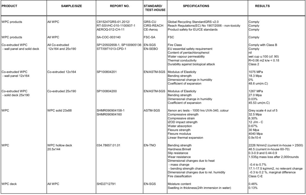Apart from conducting our own tests, our products have been tested to numerous EN, BS and ASTM standards for strength, weathering resistance/colour fastness, moisture absorption, slip resistance, etc. The tests results shown below are compiled from tests done by independent established international laboratories for our WPC products over the years. With continuous improvements being done on the material formulation and product redesign, some of these data would have improved over time.